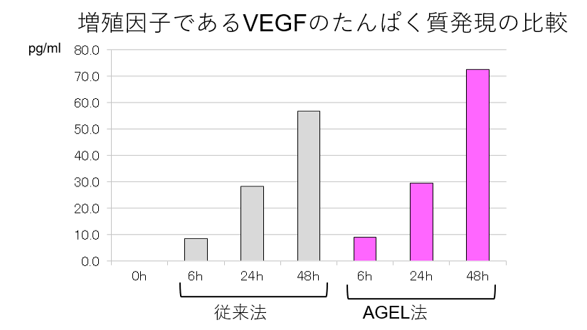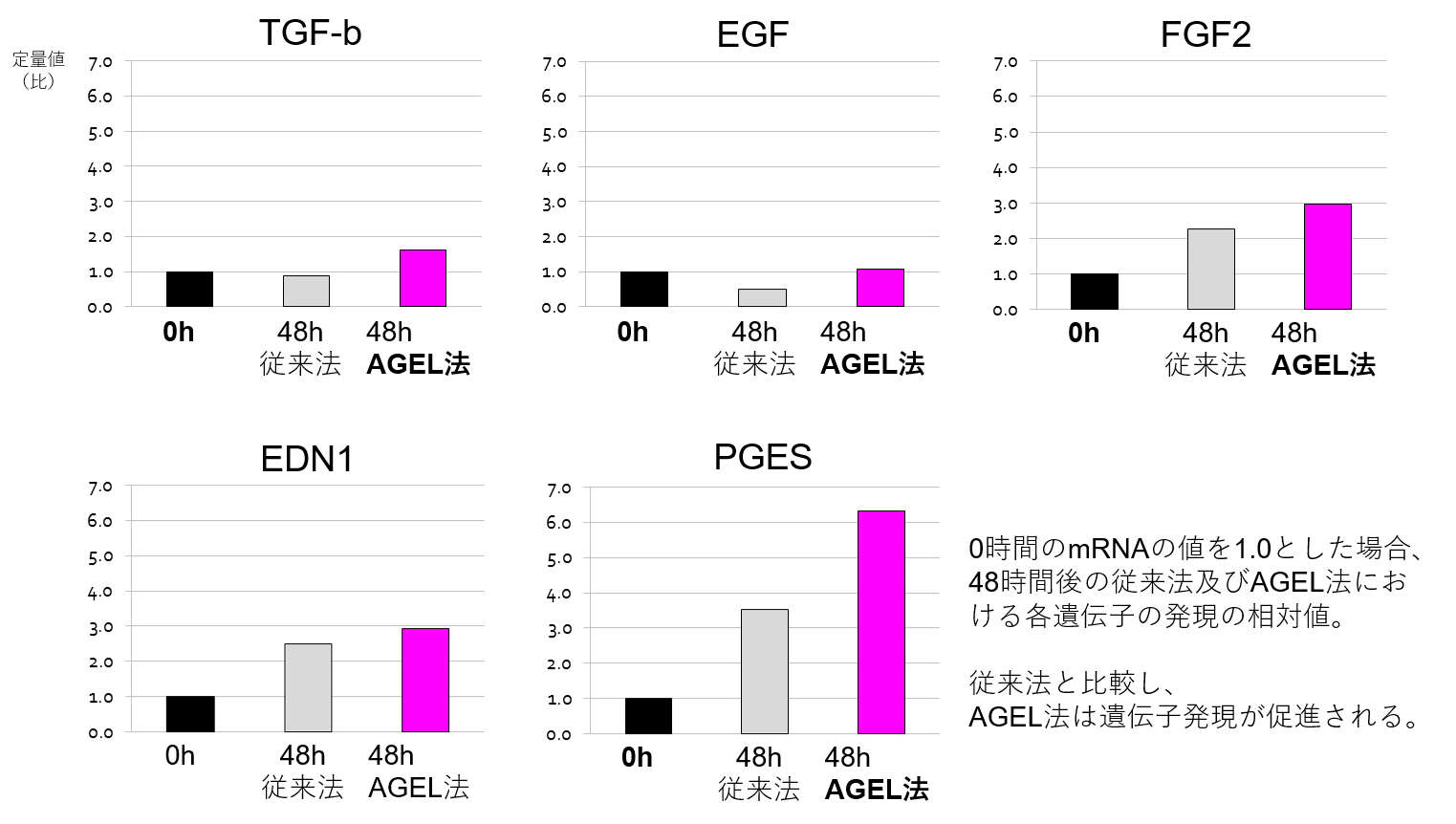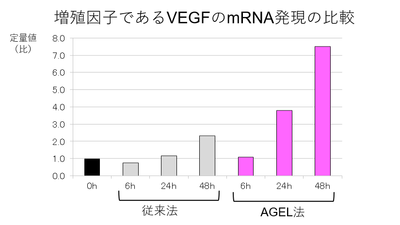 0時間のmRNAを1.0とした場合、従来法では約2倍程度の発現しかみられないが、AGEL法では約7.5の遺伝子発現が見られる。