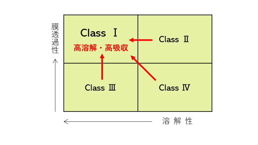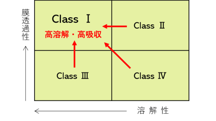 開発段階や非臨床・臨床試験においてBCS* のClass2,3,4に分類される薬物も、エリジオンの固相化技術で吸収性・安定性をClassⅠにすることが可能です。