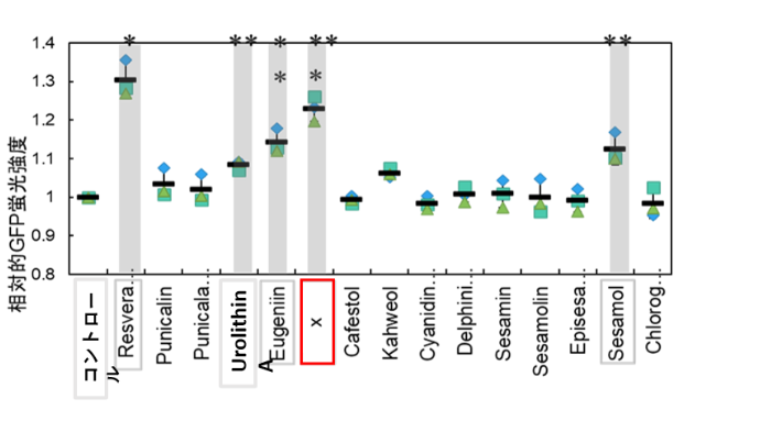 Resveratrol、Urolithin A、X、Sesamolの比較検査した。