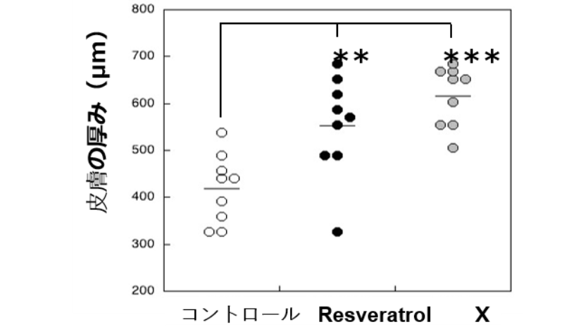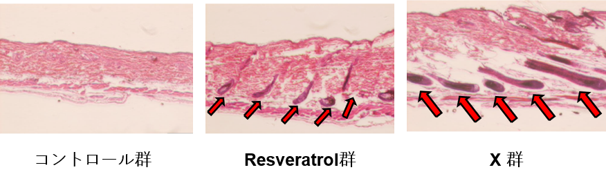 コントロール群は休止期であったのに対し、Resveratrol群及び、X群では、成長期の毛包が確認された。