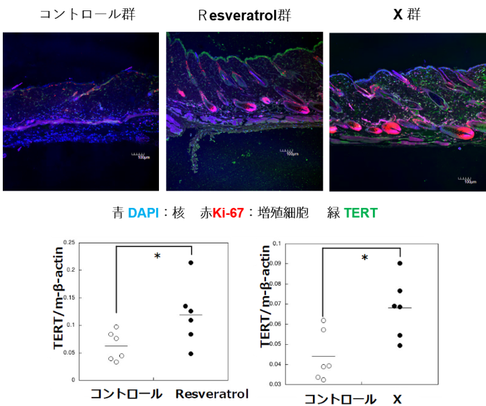 コントロール群と比較して、Resveratrol群、X群では、Ki-67及びTERTの発現が確認できた.。