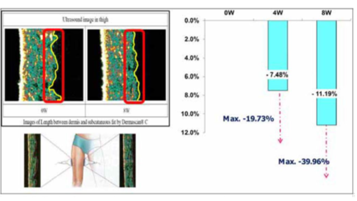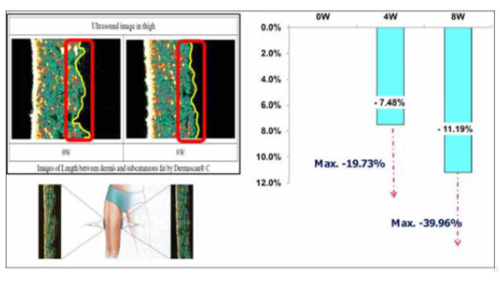 イソラムネチンを含む痩身剤を、使用開始4週間目・8週間目において測定の結果、真皮ー皮下脂肪感がより滑らかになっていることが確認できた。