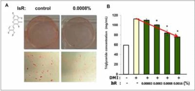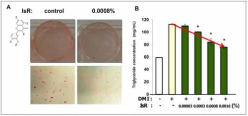 イソラムネチンによる脂肪細胞の分化抑制作用について確認するため、それぞれ異なる濃度のセリエキスを添加し、分化誘発培地にてhAMSCs細胞(ヒト脂肪由来間亜葉系幹細胞)を培養した。脂肪蓄積の確認はトリグリセリドの濃度を測定することにより行われた。